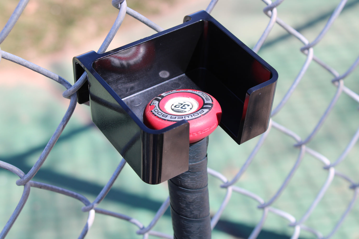 A clip-on bat holder that attaches to chain-link fences so players always have a clean, ready bat.